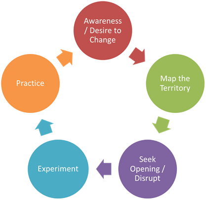 The current approach represents a way in which leadership’s current “meaning-making” structures, their repertoire of action or their ways of connecting are inadequate for their desired/required outcomes. Something is keeping the current, ineffective approach in place – a limiting mindset, a stuck structure, a conditioned habit, a constraining emotion, etc. The original patterns must be disrupted and new strategies must be experimented with before new habits can be developed.