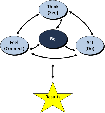 The diagram below shows the four meta competencies (slightly reformulated as think, feel, act, be), pulled out of the Venn Diagram, and shown as a system dynamics casual loop diagram. Each of the meta competencies effects the others in conscious and unconscious ways. As we have discussed, our state heavily influences how we think and feel, and consequently the actions we take. These actions have the most visible effect on the quality of results we achieve. Conversely, the results we achieve and the actions we take also affect how we think and feel, and consequently our state of being. All four meta competencies, collectively and individually, effect results. Thus, the stronger leadership’s meta competencies are, the stronger the results will be. The path to leadership development lies in strengthening these leadership meta competencies, with the Neutral Witness playing a lead role.