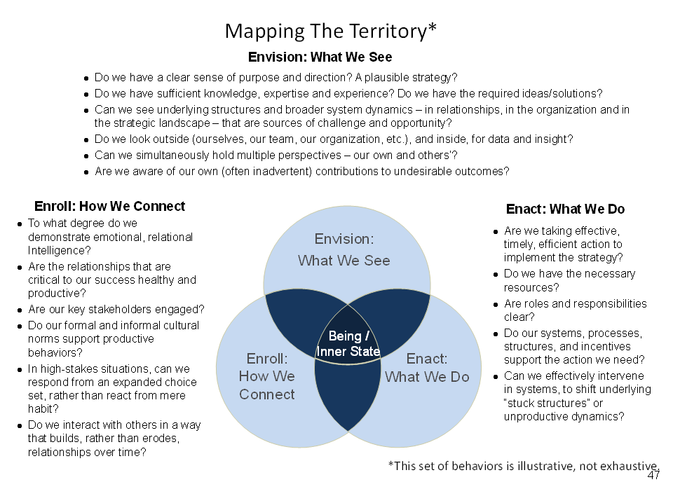 While “Mapping the Territory” is valuable to understanding the change that is required, it is also useful to remember that “the map is not the territory.” Thus, there is a paradox at play here. Mapping the Territory helps us “see more.” At the very same time, we want to maintain awareness that the mental model we are creating – the very one that helps illuminate what and how we should change to improve desired results – is just that, a mental model. Like all mental models, this map illuminates some parts of reality and obscures others. Thus, at the very same time that we invest in this map and buy into its direction, we want to hold it as a “strong idea, loosely held” and maintain active curiosity about what aspects of it are limited or evolving.